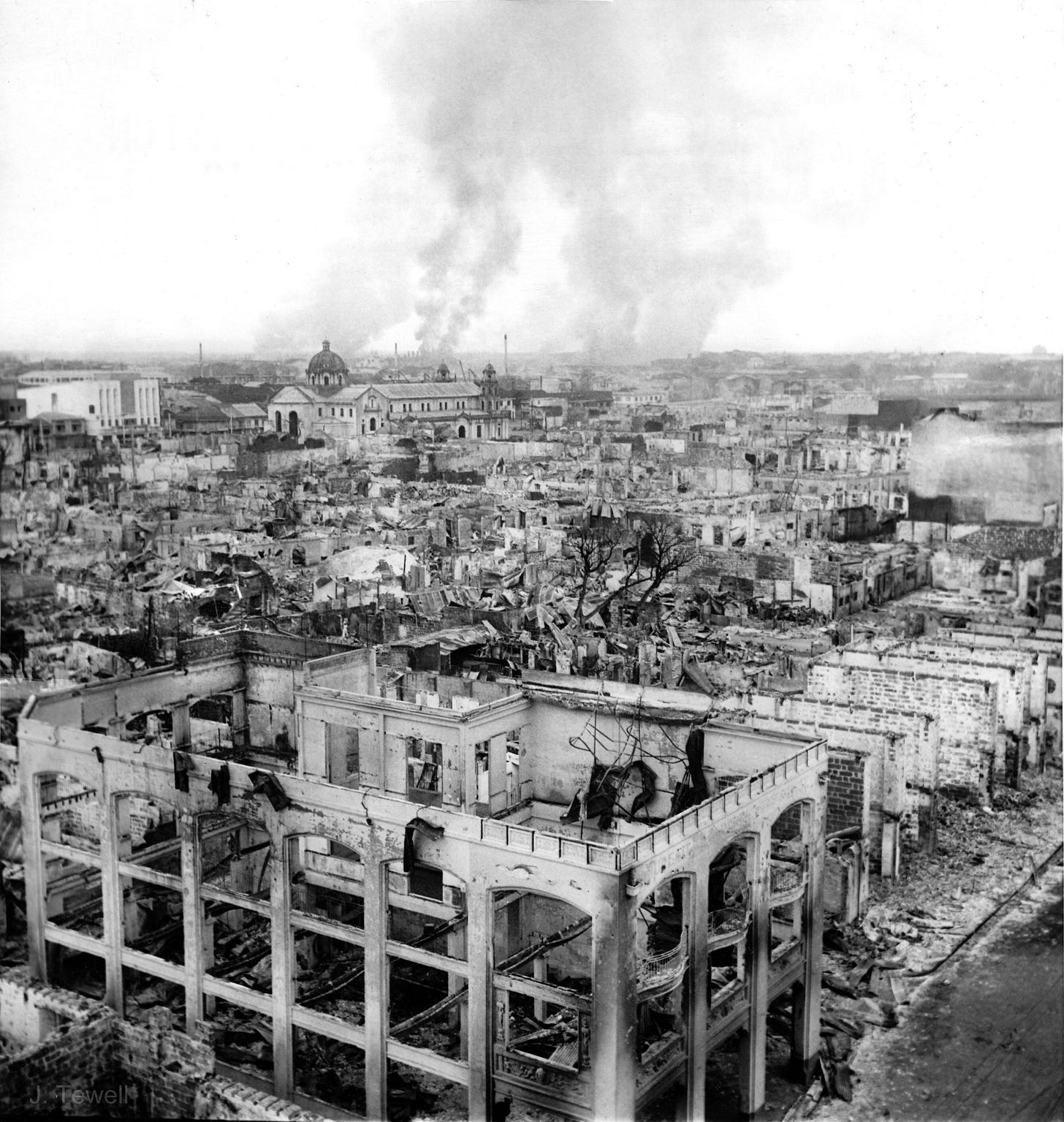 The final count: 1,000 Americans, 16,000 Japanese soldiers, and at least 100,000 unarmed Filipino civilians—10% of the population—dead in the streets. “Much of the graceful city was turned to rubble,” the Times continued. “Large parts of its rich cultural heritage—archives of the Spanish colonial era, records from the Philippine revolution, birth and death certificates, ornate churches, grand libraries and treasured art—were obliterated. Only Warsaw suffered more among Allied capitals in the war.”